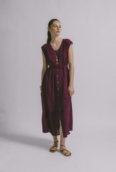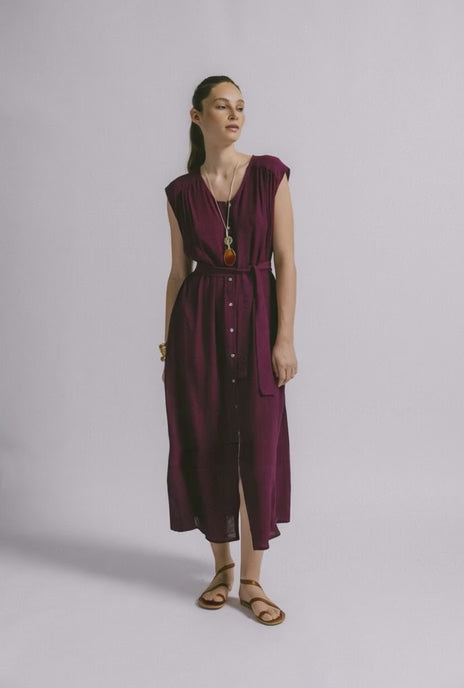 Vestido en tono burdeos, tejido ligero y vaporoso, que se caracteriza por su plisado