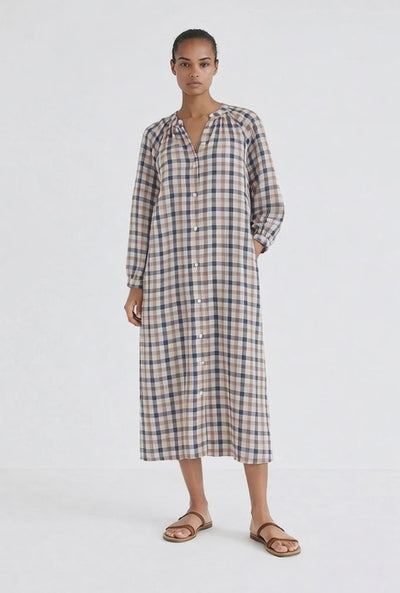 Vestido con estampado de cuadros, confeccionado en algodón orgánico con certificación GOTS, una elección responsable que cuida de tu piel y del medio ambiente. Presenta cuello con ligero escote en pico y cierre frontal con botones. Tiene un cinturón del mismo tejido que permite ajustar la cintura