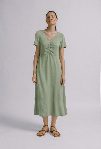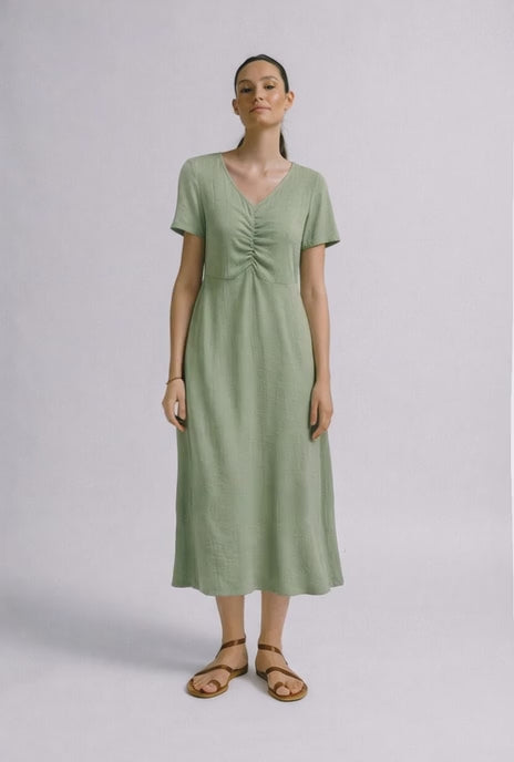 Vestido en tono verde suave, tejido ligero y vaporoso, que se caracteriza por su plisado